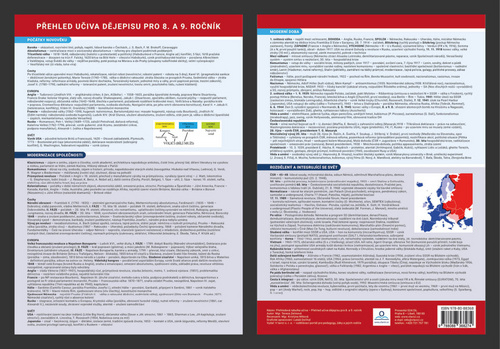 <p>Přehledně zpracované učivo dějepisu 8. a 9. ročníku pro snadné zapamatování základní výkladové látky, zpracované v souladu s RVP ZV. Karta obsahuje témata: Počátky novověku, modernizace společnosti, moderní doba, rozdělený a integrující se svět. Přehledová tabulka slouží především pro žáky druhého Stupně základní školy. </p>