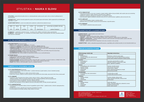 <p></p><p> Přehledně zpracovaný přehled učiva pedagogy podle potřeby žáků.</p> <p> Přehledně zpracovaný přehled slohové výchovy pro žáky druhého stupně základní školy. Styly písemného a mluveného projevu, funkční styly spisovného jazyka - podrobně zpracovaný - prostěsdělovací, administrativní, odborný, publicistický, umělecký a řečnický styl. Podrobně zpracované slohové postupy a útvary. </p> <ul> <li> Přehledová tabulka slouží pro žáky prvního a druhého stupně. </li> <li> Přehledová tabulka je pomocníkem pro žáky se speciálními vzdělávacími potřebami</li> <li> Přehledová tabulka je vhodná pro žáky připravující se na víceletá gymnázia </li> </ul>