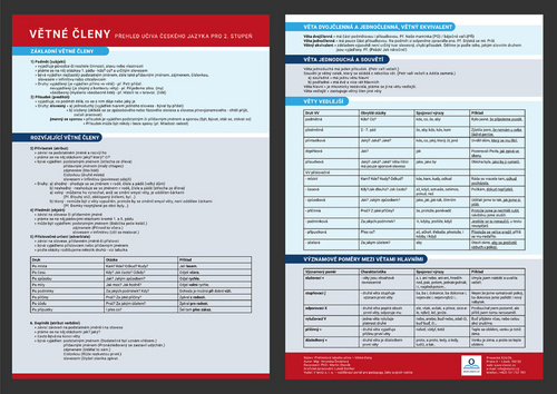 <p></p><p> Přehledně zpracovaný přehled učiva pro pedagogy podle potřeby žáků.</p> <p> Přehledová tabulka – Větné členy – ucelený přehled větné sklady, základní větné členy, rozvíjející větné členy, věta jednoduchá a souvětí, věty vedlejší, významové poměry mezi větami hlavními.</p> <ul> <li> Přehledová tabulka slouží pro žáky prvního a druhého stupně.</li> <li> Přehledová tabulka je pomocníkem pro žáky se speciálními vzdělávacími potřebami</li> <li> Přehledová tabulka je vhodná pro žáky připravující se na víceletá gymnázia</li> </ul>