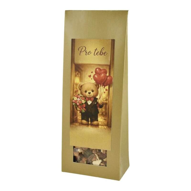 Směs ořechů a sušeného ovoce v dárkové krabičce s roztomilým motivem medvídka v obleku s kyticí květin a balony ve tvaru srdíček. Text: Pro tebe Složení: jádra lískových ořechů, mandle loupané, papája, rozinky Alergeny: mandle, lískové ořechy, SO2 Může obsahovat stopy jiných skořápkových plodů. Skladujte v suchu, chladu a ve tmě. Po otevření skladujte v uzavřené nádobě nebo v sáčku, aby se zamezilo přístupu vzduchu. V případě volného uložení dojde k navlhnutí směsi.