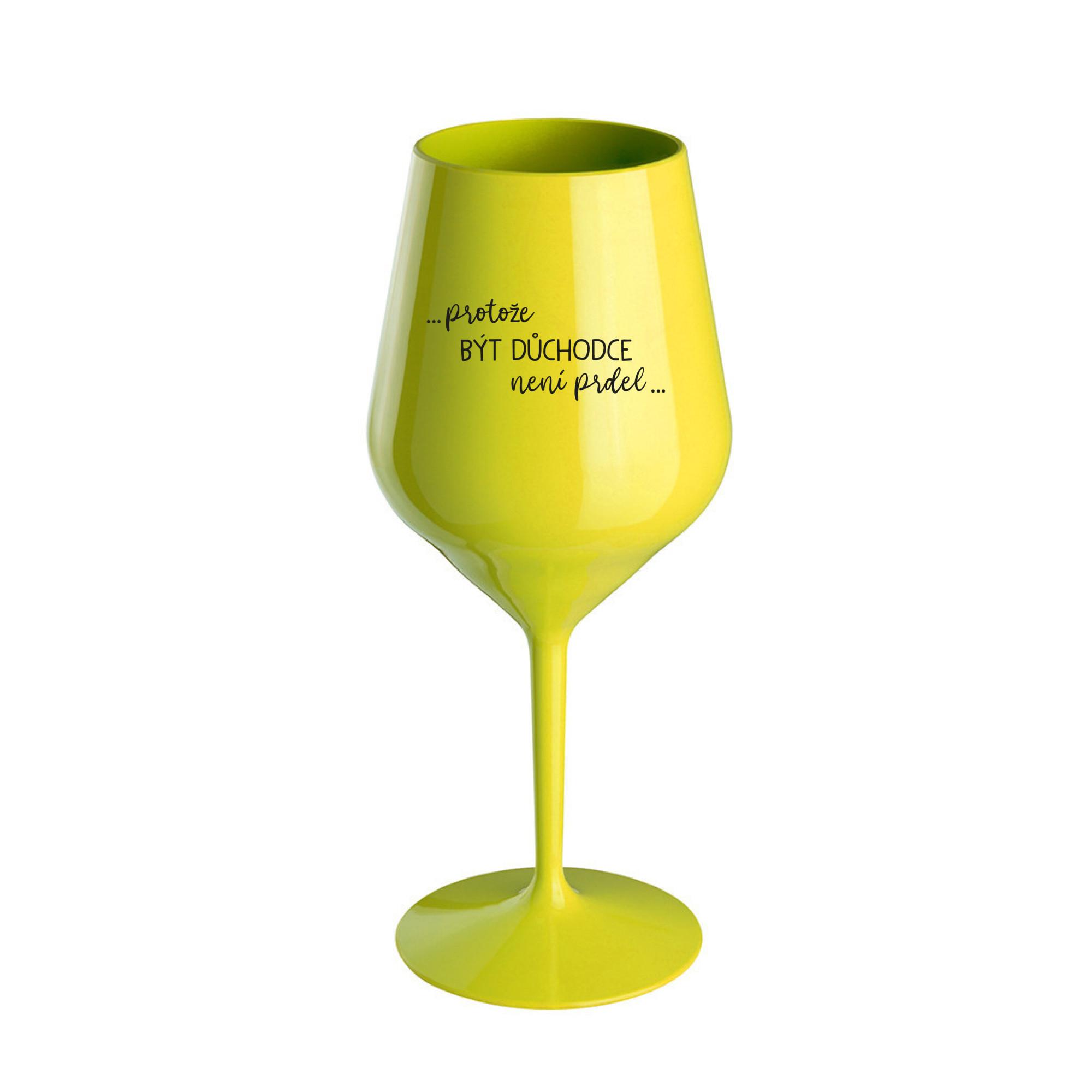 Nerozbitná žlutá vinná sklenice s motivem PROTOŽE BÝT DŮCHODCE NENÍ PRDEL je skvělá na zahradu, pláž, výlet, piknik a parádu udělá i při kempování. Jelikož je vyrobená z kvalitního polykarbonátu je de facto nerozbitná. Je to luxusní kousek, s nímž si víno můžete vychutnat prostě kdekoliv. Mají ergonomický tvar, který příjemně padne do ruky a protože je lehká, usnadňuje to její přenášení. Je snadno skladovatelná a lehce se čistí. Díky svému designu si s ní můžete vychutnat doopravdy kdekoliv bezproblémové pití výborného vína. Materiál PP. Vyrobené s láskou v ČR