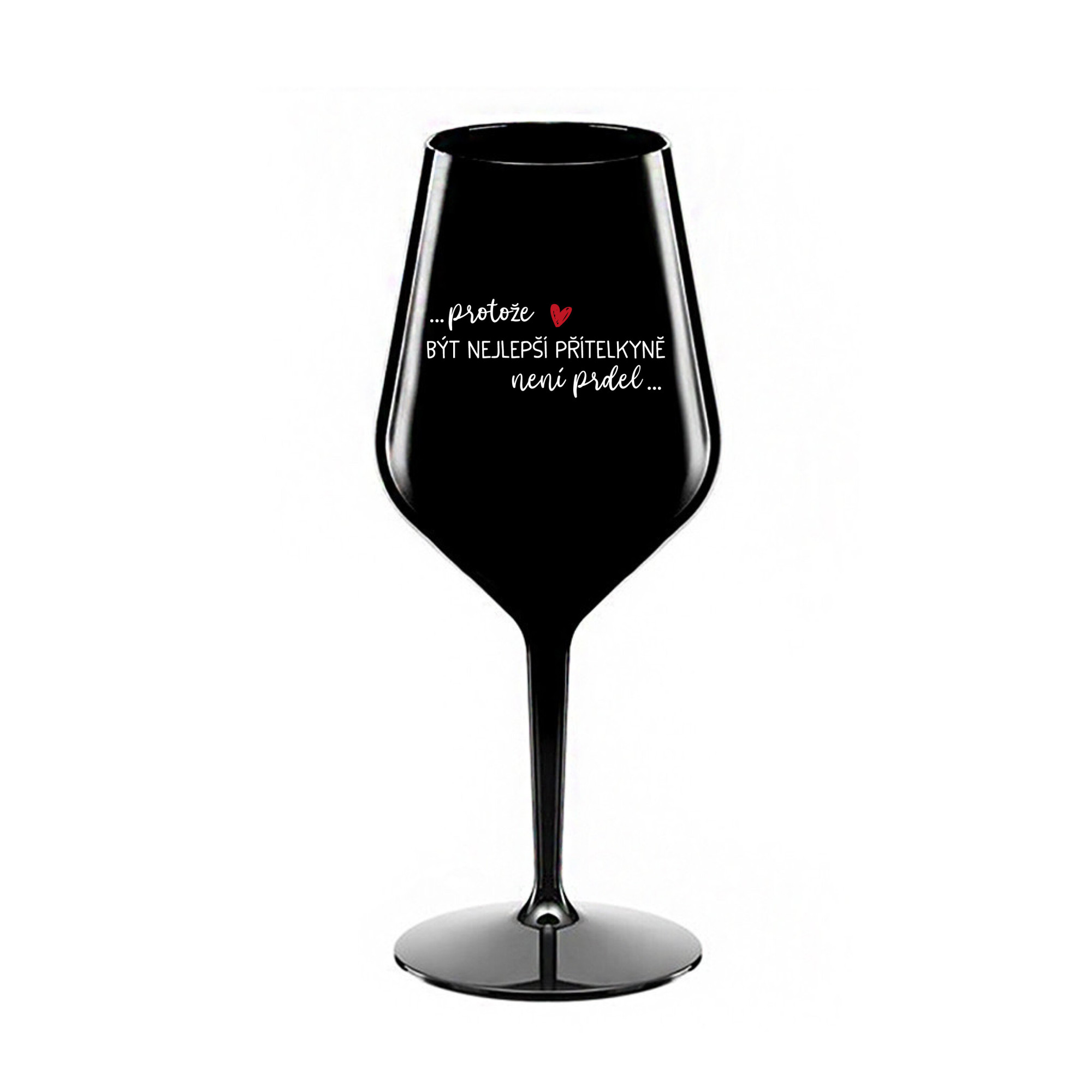Nerozbitná černá vinná sklenice s motivem PROTOŽE BÝT NEJLEPŠÍ PŘÍTELKYNĚ NENÍ PRDEL je skvělá na zahradu, pláž, výlet, piknik a parádu udělá i při kempování. Jelikož je vyrobená z kvalitního polykarbonátu je de facto nerozbitná. Je to luxusní kousek, s nímž si víno můžete vychutnat prostě kdekoliv. Mají ergonomický tvar, který příjemně padne do ruky a protože je lehká, usnadňuje to její přenášení. Je snadno skladovatelná a lehce se čistí. Díky svému designu si s ní můžete vychutnat doopravdy kdekoliv bezproblémové pití výborného vína. Materiál PP. Vyrobené s láskou v ČR