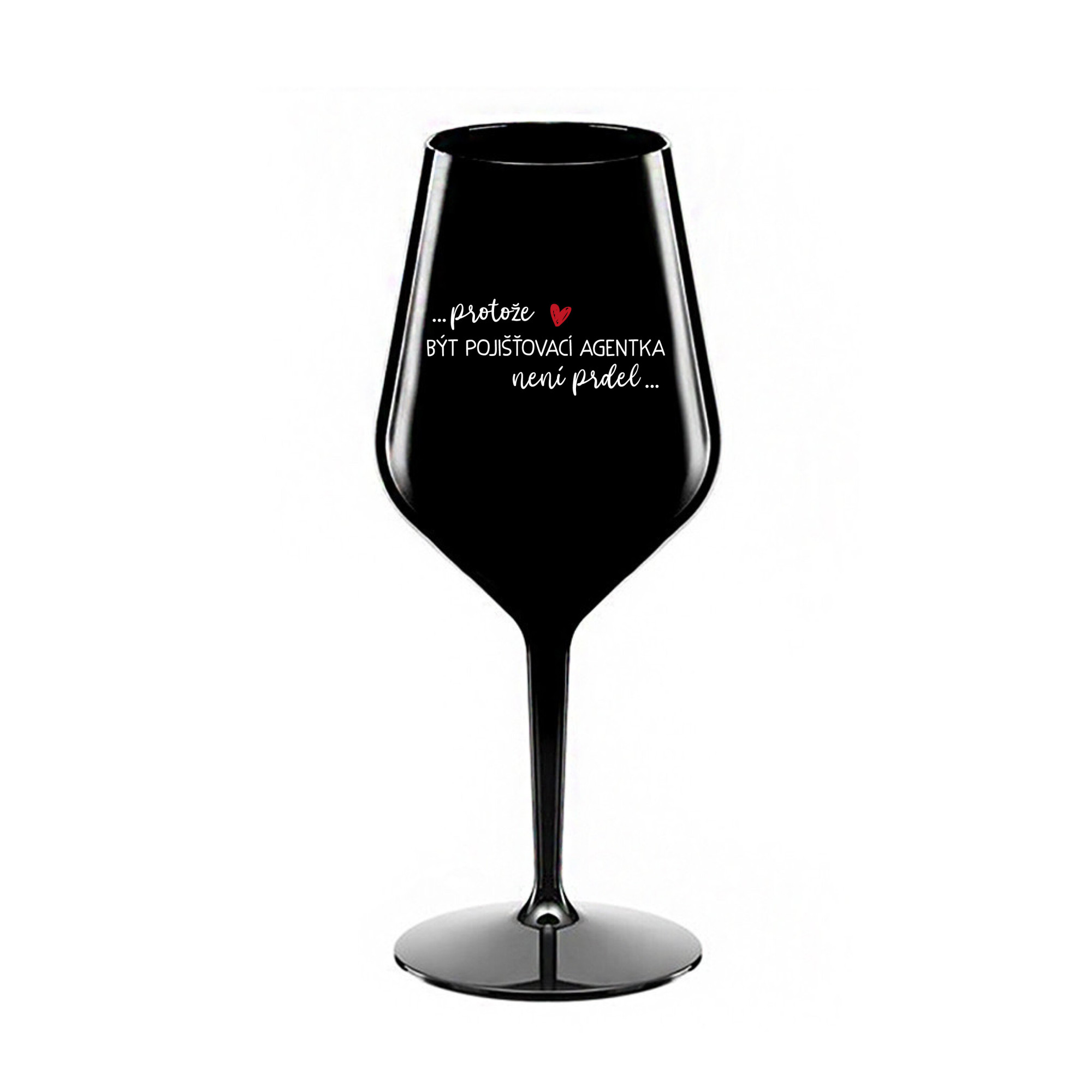 Nerozbitná černá vinná sklenice s motivem PROTOŽE BÝT POJIŠŤOVACÍ AGENTKA NENÍ PRDEL je skvělá na zahradu, pláž, výlet, piknik a parádu udělá i při kempování. Jelikož je vyrobená z kvalitního polykarbonátu je de facto nerozbitná. Je to luxusní kousek, s nímž si víno můžete vychutnat prostě kdekoliv. Mají ergonomický tvar, který příjemně padne do ruky a protože je lehká, usnadňuje to její přenášení. Je snadno skladovatelná a lehce se čistí. Díky svému designu si s ní můžete vychutnat doopravdy kdekoliv bezproblémové pití výborného vína. Materiál PP. Vyrobené s láskou v ČR