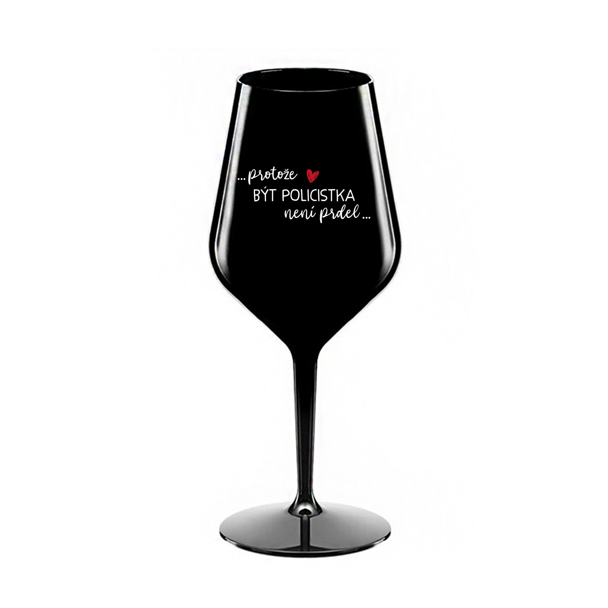Nerozbitná černá vinná sklenice s motivem PROTOŽE BÝT POLICISTKA NENÍ PRDEL je skvělá na zahradu, pláž, výlet, piknik a parádu udělá i při kempování. Jelikož je vyrobená z kvalitního polykarbonátu je de facto nerozbitná. Je to luxusní kousek, s nímž si víno můžete vychutnat prostě kdekoliv. Mají ergonomický tvar, který příjemně padne do ruky a protože je lehká, usnadňuje to její přenášení. Je snadno skladovatelná a lehce se čistí. Díky svému designu si s ní můžete vychutnat doopravdy kdekoliv bezproblémové pití výborného vína. Materiál PP. Vyrobené s láskou v ČR