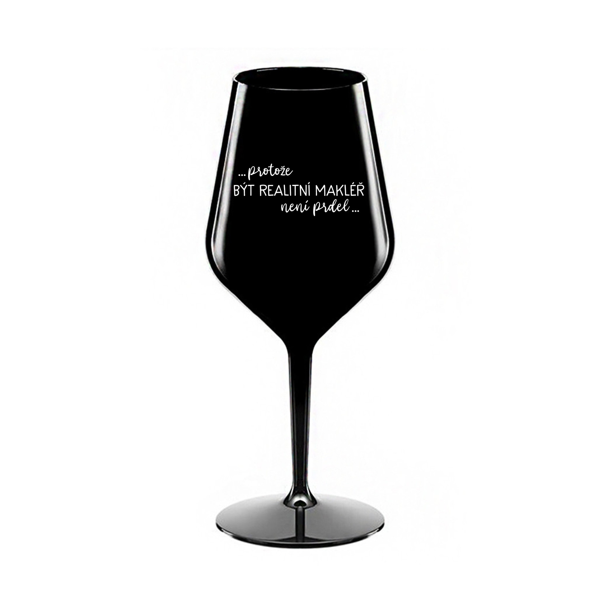 Nerozbitná černá vinná sklenice s motivem PROTOŽE BÝT REALITNÍ MAKLÉŘ NENÍ PRDEL je skvělá na zahradu, pláž, výlet, piknik a parádu udělá i při kempování. Jelikož je vyrobená z kvalitního polykarbonátu je de facto nerozbitná. Je to luxusní kousek, s nímž si víno můžete vychutnat prostě kdekoliv. Mají ergonomický tvar, který příjemně padne do ruky a protože je lehká, usnadňuje to její přenášení. Je snadno skladovatelná a lehce se čistí. Díky svému designu si s ní můžete vychutnat doopravdy kdekoliv bezproblémové pití výborného vína. Materiál PP. Vyrobené s láskou v ČR