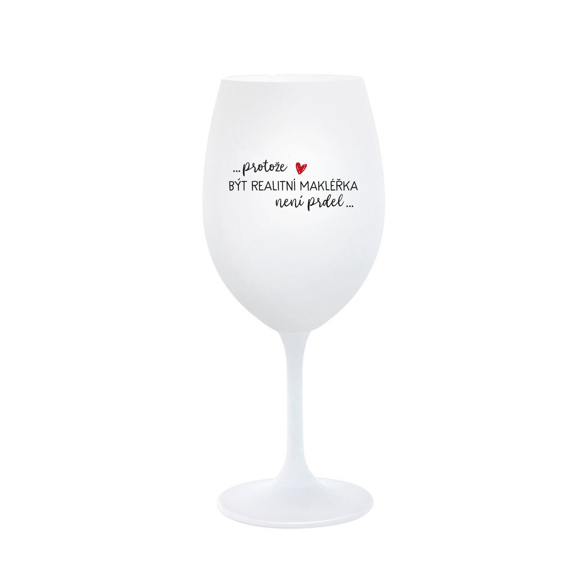 Vinná bílá sklenice s originálním motivem PROTOŽE BÝT REALITNÍ MAKLÉŘKA NENÍ PRDEL je krásným a osobitým dárkem, které ale využijete i Vy sami třeba ve chvílích, kdy si budete chtít zpříjemnit náročný den. Tyto originální vinné sklenice jsou totiž nejen pro výjimečné události, ale i pro běžné večery, které si chcete zpříjemnit sklenkou dobrého vína. Jistě proto potěší každého milovníka vína, i toho, kdo si umí svůj život vychutnat plnými doušky. Materiál sklo. Vyrobené s láskou v ČR