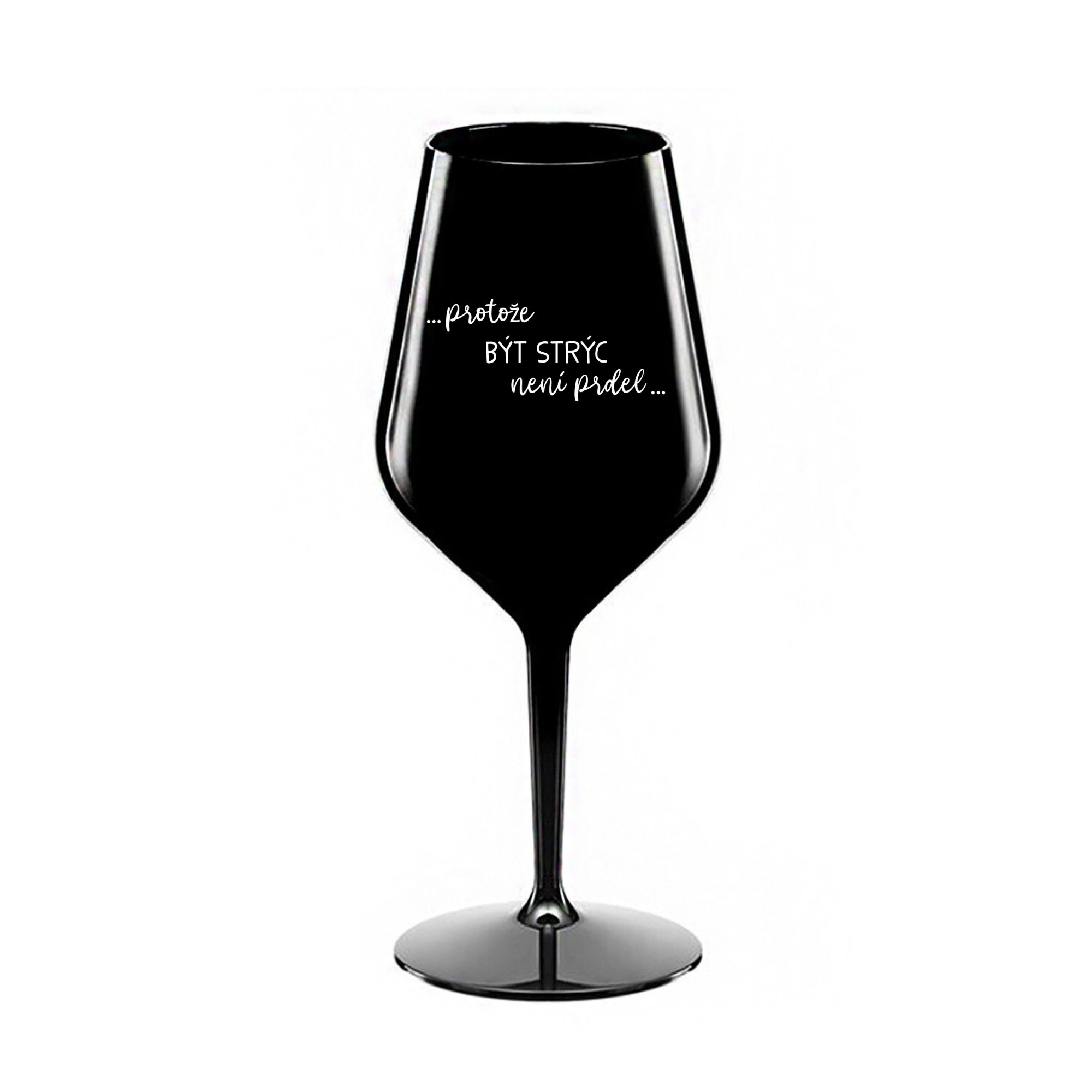 Nerozbitná černá vinná sklenice s motivem PROTOŽE BÝT STRÝC NENÍ PRDEL je skvělá na zahradu, pláž, výlet, piknik a parádu udělá i při kempování. Jelikož je vyrobená z kvalitního polykarbonátu je de facto nerozbitná. Je to luxusní kousek, s nímž si víno můžete vychutnat prostě kdekoliv. Mají ergonomický tvar, který příjemně padne do ruky a protože je lehká, usnadňuje to její přenášení. Je snadno skladovatelná a lehce se čistí. Díky svému designu si s ní můžete vychutnat doopravdy kdekoliv bezproblémové pití výborného vína. Materiál PP. Vyrobené s láskou v ČR