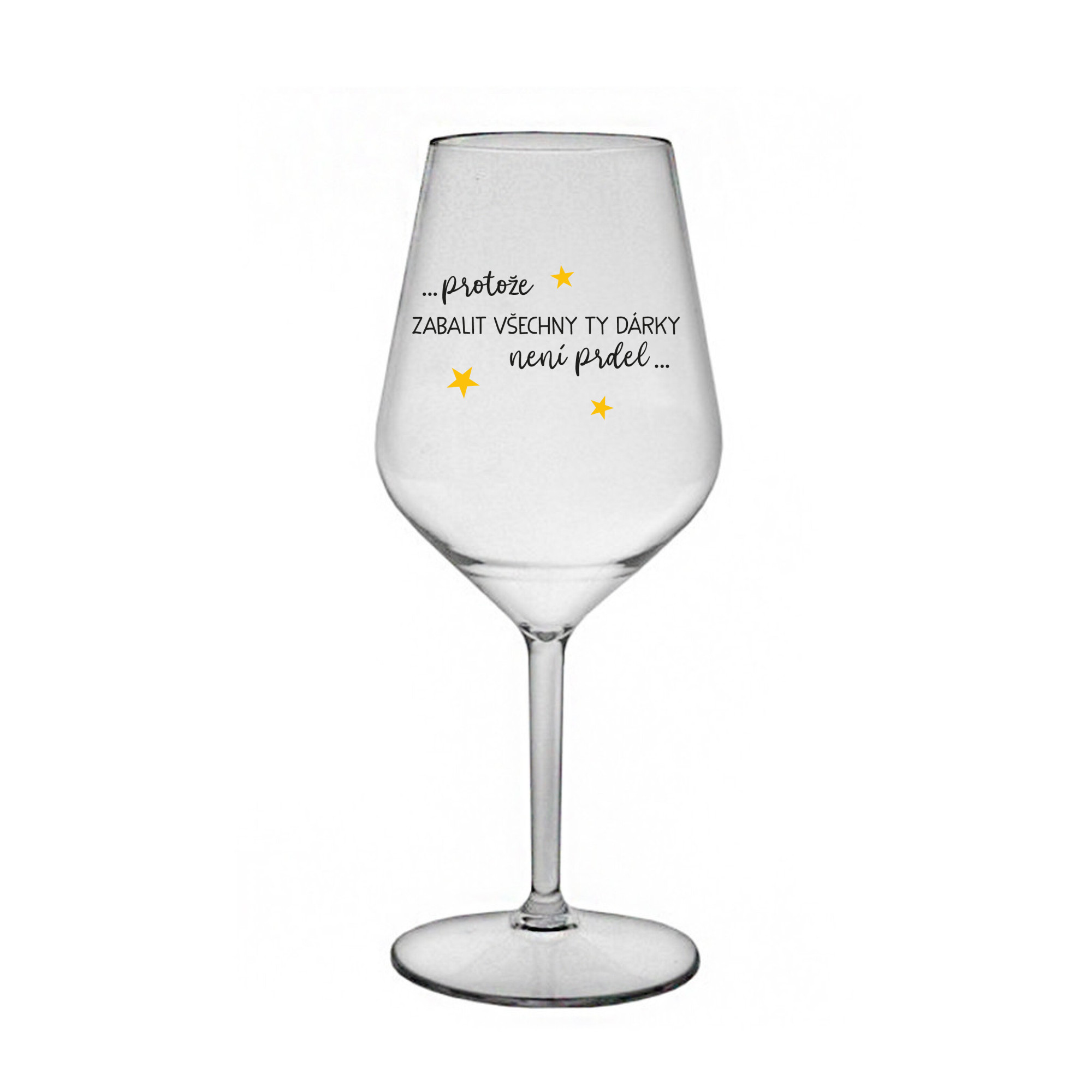Nerozbitná čirá vinná sklenice s motivem PROTOŽE ZABALIT DÁRKY NENÍ PRDEL je skvělá na zahradu, pláž, výlet, piknik a parádu udělá i při kempování. Jelikož je vyrobená z kvalitního polykarbonátu je de facto nerozbitná. Je to luxusní kousek, s nímž si víno můžete vychutnat prostě kdekoliv. Mají ergonomický tvar, který příjemně padne do ruky a protože je lehká, usnadňuje to její přenášení. Je snadno skladovatelná a lehce se čistí. Díky svému designu si s ní můžete vychutnat doopravdy kdekoliv bezproblémové pití výborného vína. Materiál PP. Vyrobené s láskou v ČR