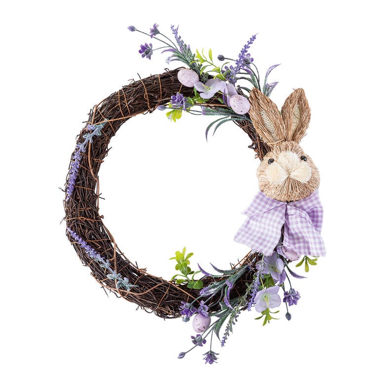 Proutěný věnec s roztomilým zajíčkem s fialovou mašlí, umělými levandulovými kvítky, barevnými vajíčky a další jarní drobotinou krásně ozdobí vaše dveře či okno, ať už doma nebo třeba na chalupě. Věneček je opatřen očkem na zavěšení.