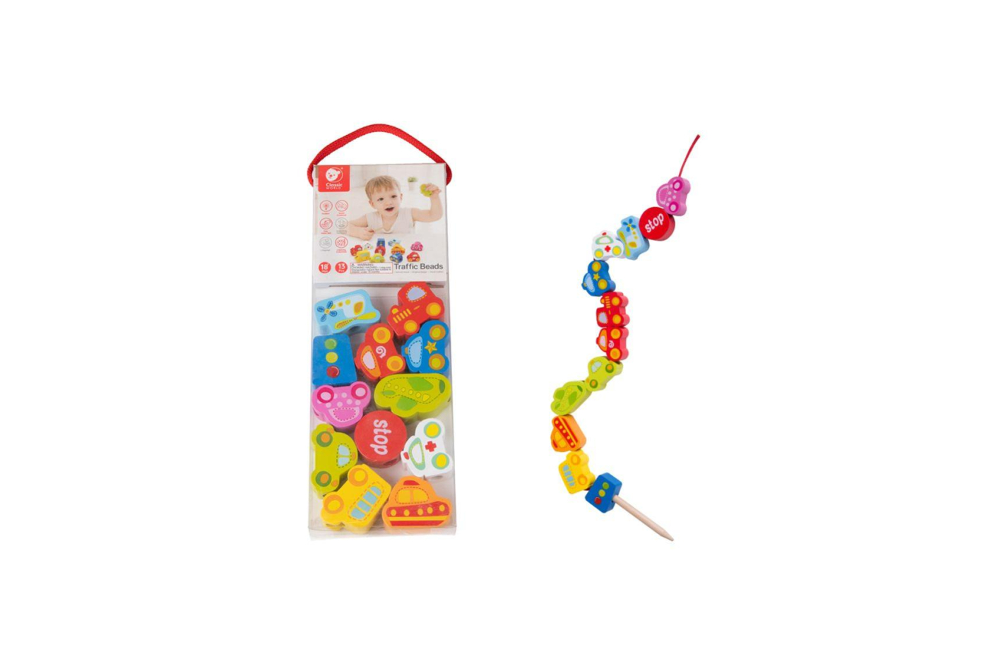 Barevná provlékačka s motivy autíček, letadel a semaforů potěší každého malého fanouška dopravy. Dřevěné dílky se snadno navlékají na šňůrku díky velkým otvorům a pomáhají dětem rozvíjet jemnou motoriku, trpělivost a představivost. Sada obsahuje 13 veselých tvarů, které lze využít i k poznávání barev nebo při hraní na dopravu. Rozměr balení: 9,5 × 26 cm Vhodné pro děti od 18 měsíců