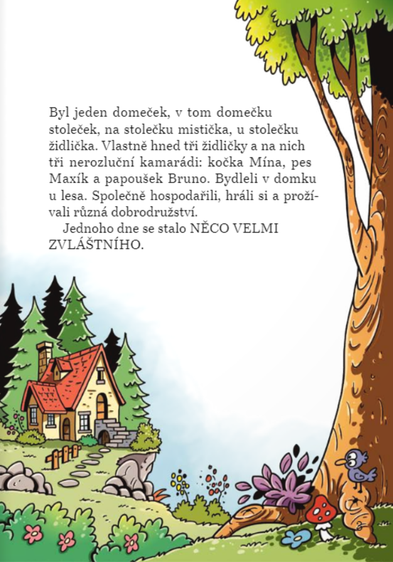 Byl jednou jeden domeček a v něm žili tři nerozluční kamarádi - kočička Mína, pejsek Max a papoušek Bruno. A jednoho dne se vydali na nečekané úžasné dobrodružství mezi nebem a zemí, na cestu plnou kouzel, napětí a tajemství. Knížka pro začínající čtenáře má text a velikost písma přizpůsobený jejich schopnostem a dovednostem. Veselé barevné ilustrace, které děti v tomto věku na první pohled zaujmou, je vtáhnou do děje a přivedou k zájmu o čtení. Tři hlavní postavy jsou zároveň hlavními průvodci předškoláků v sérii čtyř pracovních sešitů pro mateřské školy: Mína a Maxík půjdou do školy: PODZIM, ZIMA, JARO, LÉTO. První kniha výrazně ovlivňuje vztah dítěte ke čtení. Naše kniha z něj udělá zvídavého čtenáře. :-) Knihu jsme vyvinuli co nejpřístupnější začínajícímu čtenáři. Příběh je zábavný a veselý, přesně takový aby první kniha dítě namotivovala k dalšímu čtení. Pečlivě jsme zvolili velikost písma a font, aby čtení bylo pohodlné pro naprosté nováčky. Příběh má souvislý a snadno pochopitelná děj, od kterého se dítě neodtrhne a bude ho bavit. Na stránkách je hodně barevných obrázků, které zaujmou a rozesmějí. Textu je spíše méně, aby se dítě neunavilo a mělo pocit, že se posouvá vpřed. Což ho motivuje k dalšímu čtení. Výhodou je, že knihy s Mínou a Maxíkem znají děti ze školky, takže se známými postavami jim čtení půjde mnohem lépe.