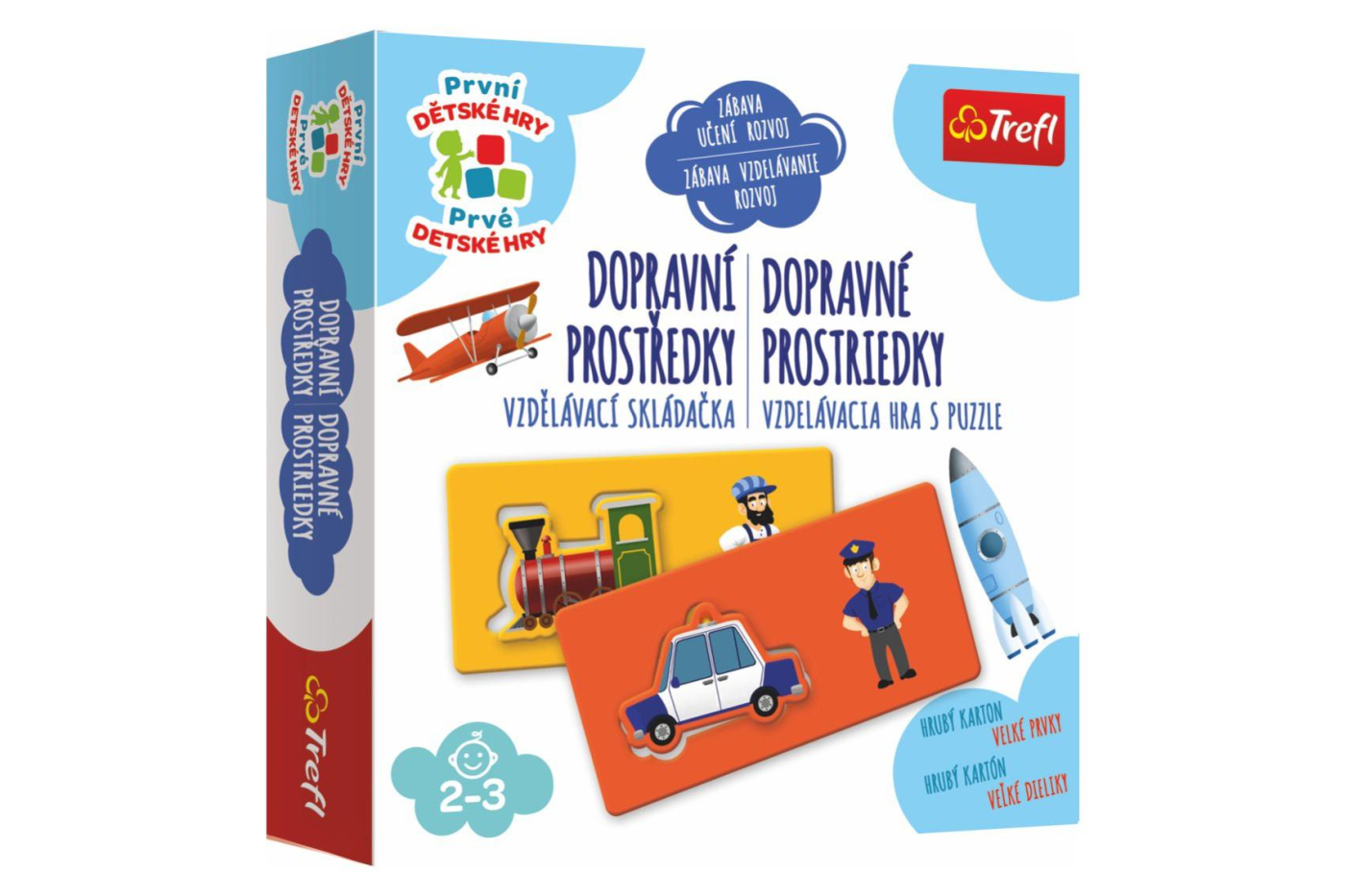 Vzdělávací skládačka pro děti. Dopravní prostředky jsou vzdělávací skládačka určená pro děti. Při této zábavné hře se učí názvy různých dopravních prostředků, jejich vlastnosti a názvy jejich řidičů. seznamování se dopravními prostředky jednoduchá pravidla pestrobarevné obrázky vyrobeno ze silného kartonu velké dílky pro snadné uchopení Hra obsahuje: 12 kartiček s dopravními prostředky a jejich řidiči a návod pro rodiče.