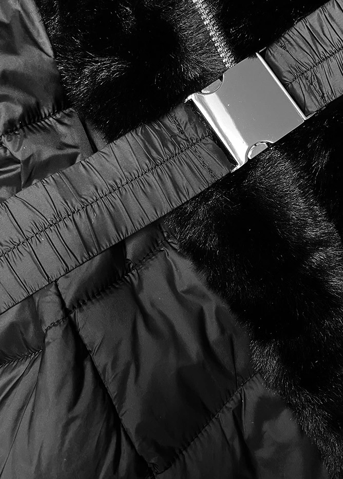 Věnujte prosím pozornost při výběru velikosti dle velikostní tabulky uvedené níže. Velikosti neodpovídají běžně nošené konfekci. Prošívaná bunda s kapucí Bunda je lehce vypasovaná, je zateplená syntetickou péřovou výplní, má opasek s přezkou, dvě kapsy se zapínáním na zip a zapíná se zipem. Model má kapuci, kterou není možné odepnout. Bundu zdobí kožešiny, které není možné odepnout. Model má délku do poloviny stehen. Složení: 100 % polyester.