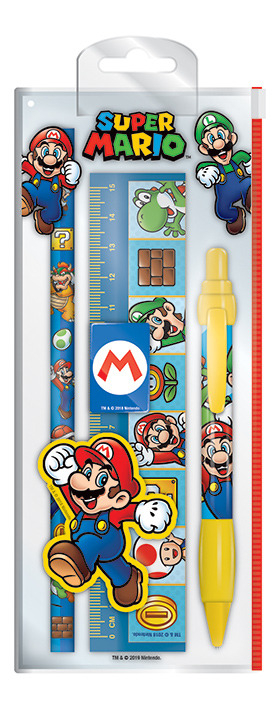 Krásný školní set s populárním motivem Super Mario. Obsahuje propisku, tužku, pravítko a gumu.