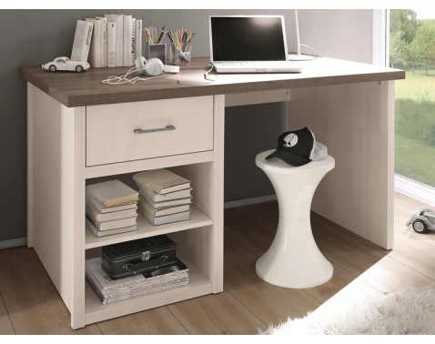 Psací stůl z kolekce Luca v elegantním venkovském stylu. Kouzlo nábytku podtrhují dekorativní reliéfy a kombinace bělené pinie s útulnými dubovými tóny.