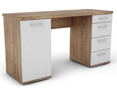 Prostorný psací stůl s pevnou konstrukcí, levými dveřmi a zásuvkami pro přehledné uložení věcí. Vyroben v kombinaci dub burgund a bílé barvy.