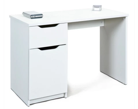Psací stůl v bílé barvě série Westphalen má zaoblený profilovaný úchyt, praktickou zásuvku a otočné dveře s úložným prostorem.