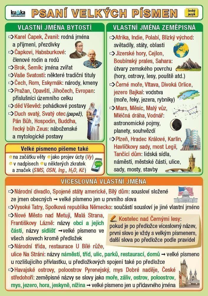 Přehledně zpracovaná a bohatě ilustrovaná pomůcka pro hravé zvládnutí psaní velkých písmen v češtině. vlastní jména bytostí, vlastní jména zeměpisná, víceslovná vlastní jména, jedinečné instituce, dokumenty, díla, noviny, vyznamenání, významné dny a svátky příklady užití malého počátečního písmene tabulka Pozor na rozdíly