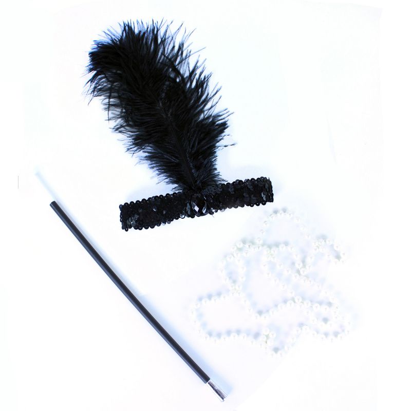 Tato sada obsahuje ikonickou cigaretovou špičku, čelenku s peřím a perlové korále – vše, co potřebujete pro dokonalý flapper look! Skvěle se hodí na tematické večírky, plesy, karnevaly nebo firemní akce. Stačí přidat šaty s třásněmi a můžete se směle pustit do víru charlestonu!