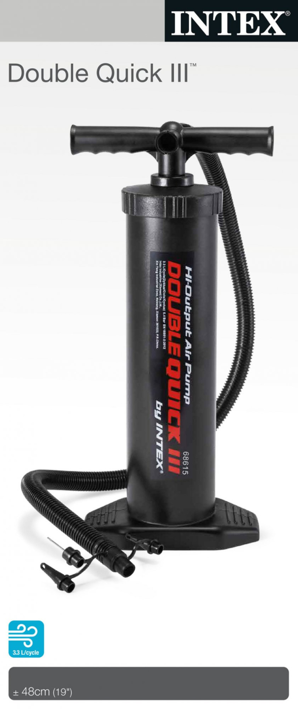 Pumpa DOUBLE QUICK III je ruční pumpa s hadicí pro rychlé nafukování a vyfukování bazénů, matrací, lehátek, míčů či dětských hraček. Dvojí působení dovolí pumpovat směrem nahoru i směrem dolu. Pro nafouknutí a vyfouknutí stačí změnit směr proudícího vzduchu. Pumpa disponuje vysokým průtokem vzduchu pro rychlejší nafouknutí. Velikost pumpy je 48 cm. Rozměr balení: 20 x 48 x 12 Vhodné od 14 let