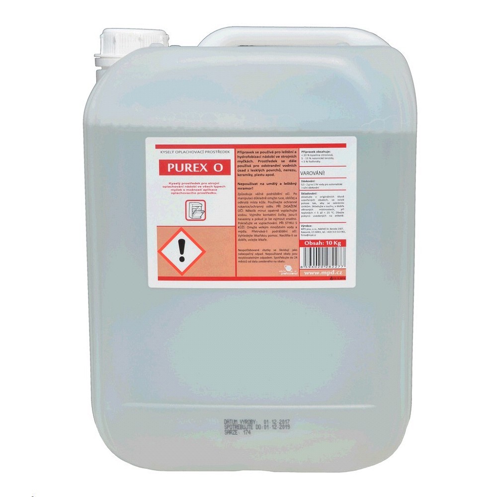 PUREX O oplachovač pro myčky nádobí 10 kg Kyselý tekutý oplachovací, leštící a sušící detergent, určený pro všechny myčky, které umožňují dávkování oplachového prostředku. Purex O snižuje množství vody a vápenatých usazenin na povrchu nádobí. Skleněné povrchy získávají původní lesk a dochází ke snažšímu sušení. Je určen pro použití v kombinaci s alkalickým mycím prostředkem.