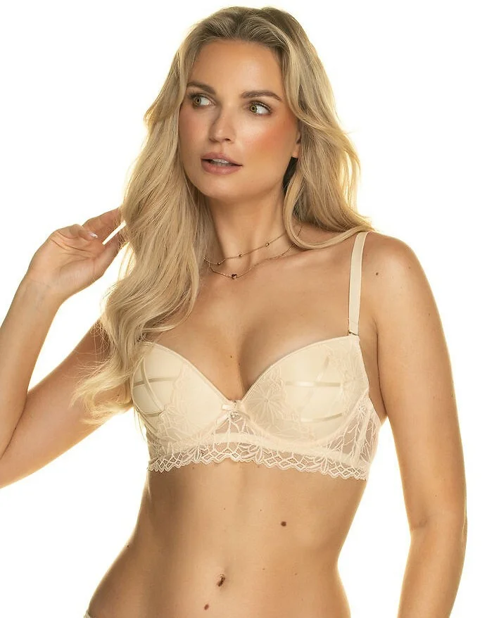 Push-up podprsenka - tepelně tvarované košíčky, s kosticemi - z jemného tylu a krajky, s jemnými překříženými ramínky - na švu košíčků saténová mašlička s lesklým přívěskem. - odnímatelná a nastavitelná ramínka - boky se svislými velrybími kosticemi - zapínání na dva háčky se čtyřstupňovou regulací - model dokonale nadnáší a modeluje poprsí, které opticky zvětšuje Složení: 90 % polyamid, 10 % elastan
