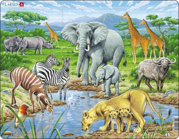 The watering hole of an African savannah is always an exciting and popular place for many species of animals to visit. Elephants always make an appearance and enjoy splashing in the water. Buffalo, antelope, and zebras also visit the water to get a drink during the hot part of the day. Can you find the lion cubs who have come to play? Even a rhinoceros or two enjoy the green plants the water provides. How many giraffes graze far out from the water’s edge? With 65 tailor made pieces this puzzle is perfect for slightly older animal loving children. The bird in the bottom left corner is 'cardinal quelea'. with 65 pieces