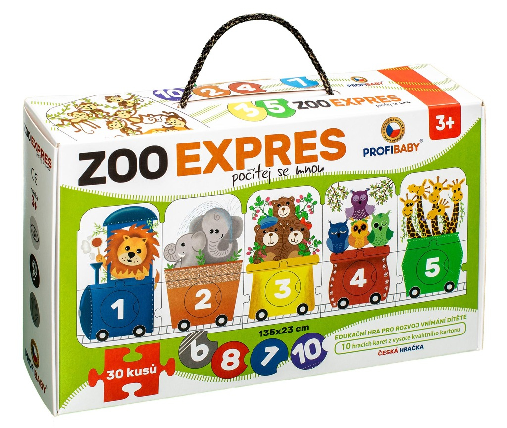 Balení puzzle 30 dílků osahuje obrázky jedné lokomotivy a 9 vagonků se zvířátky a čísly. Hra propojuje krativní dětskou hru a učení se novým znalostem a dovednostem. Děti se při hraní učí přiřazování správných částí puzzle, názvy zvířátek a číselnou stupnici, čímž rozvíjejí mentální schopnosti, a kognitivní a motorické dovednosti přiměřené batolecímu a předškolnímu věku. Velikost obrázku 135×23 cm.