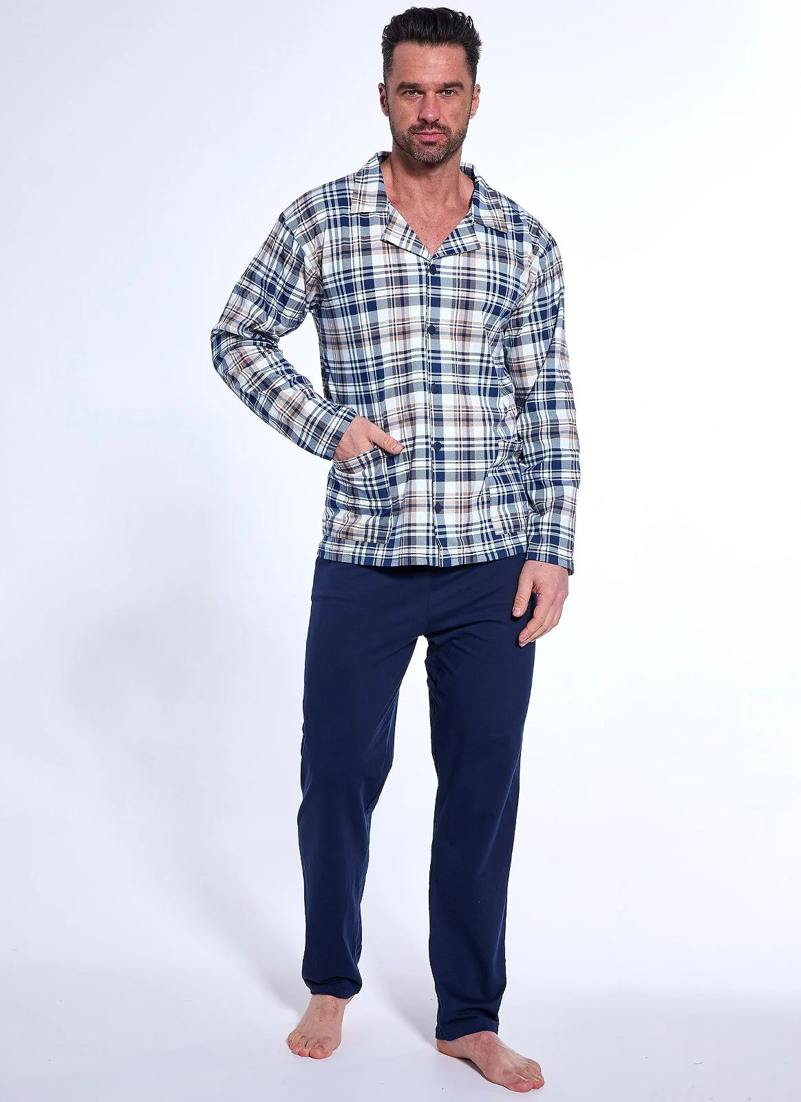 Pyžamo Cornette 114/77 dlouhé/r M-2XL rozepínací tmavě modrá - mřížka L