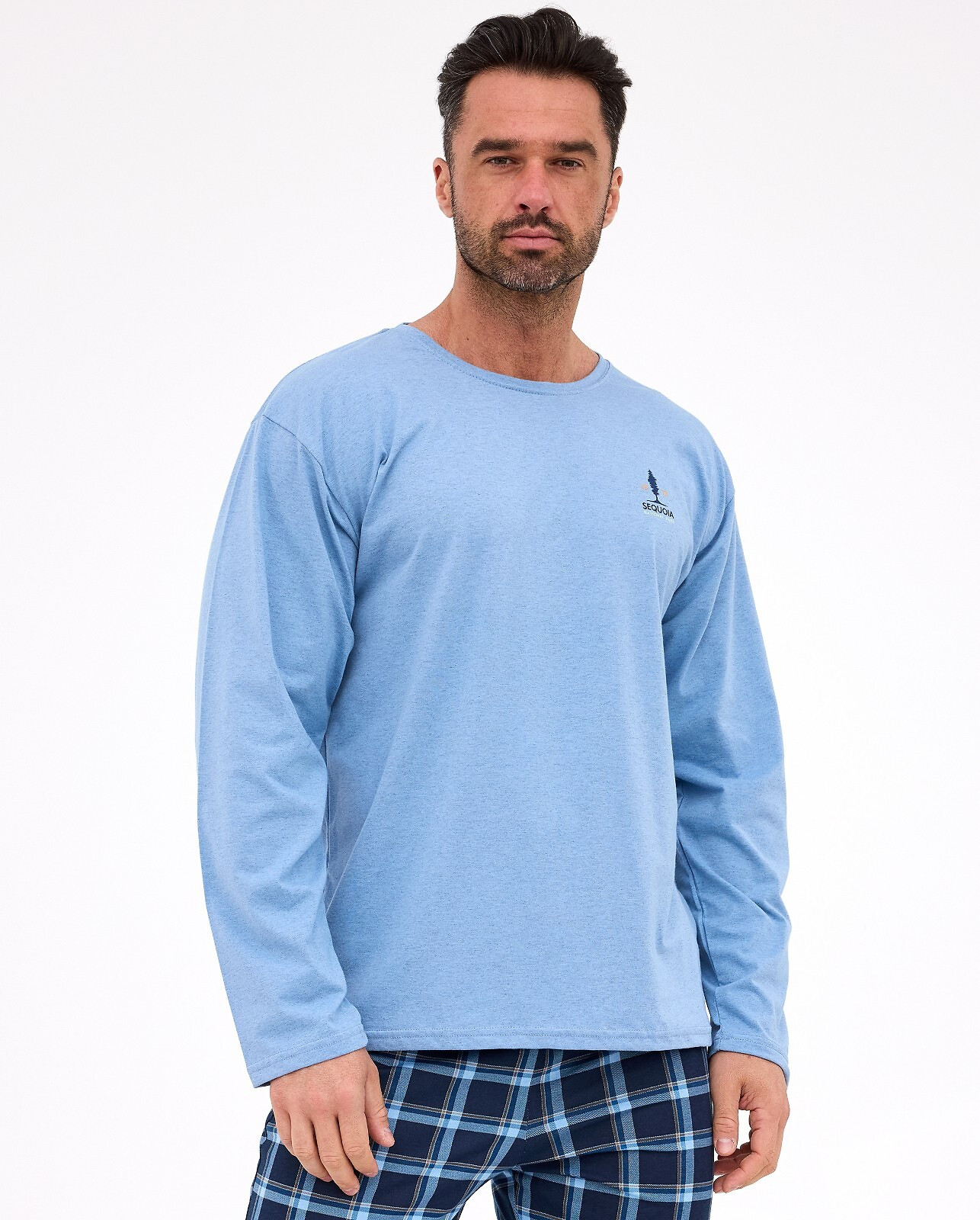 Pánské bavlněné pyžamo - tričko s dlouhým rukávem - půlkruhový výstřih - malý potisk na hrudi - dlouhé kostkované kalhoty - v pase guma lemovaná bavlnou Složení: tričko 80 % bavlna, 20 % polyester; kalhoty 100 % bavlna