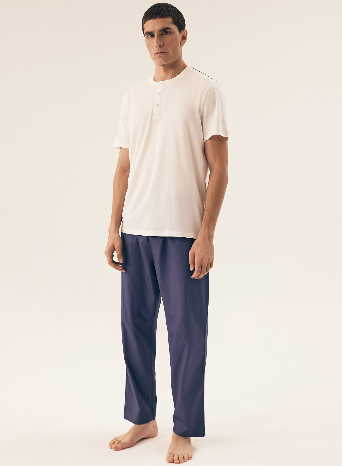 Pánské bavlněné pyžamo - pevná pletená košile - výstřih se třemi knoflíky - dlouhé kalhoty z tenké bavlněné tkaniny - v pase guma a šňůrka na stažení pro úpravu obvodu pasu Složení: 100% bavlna