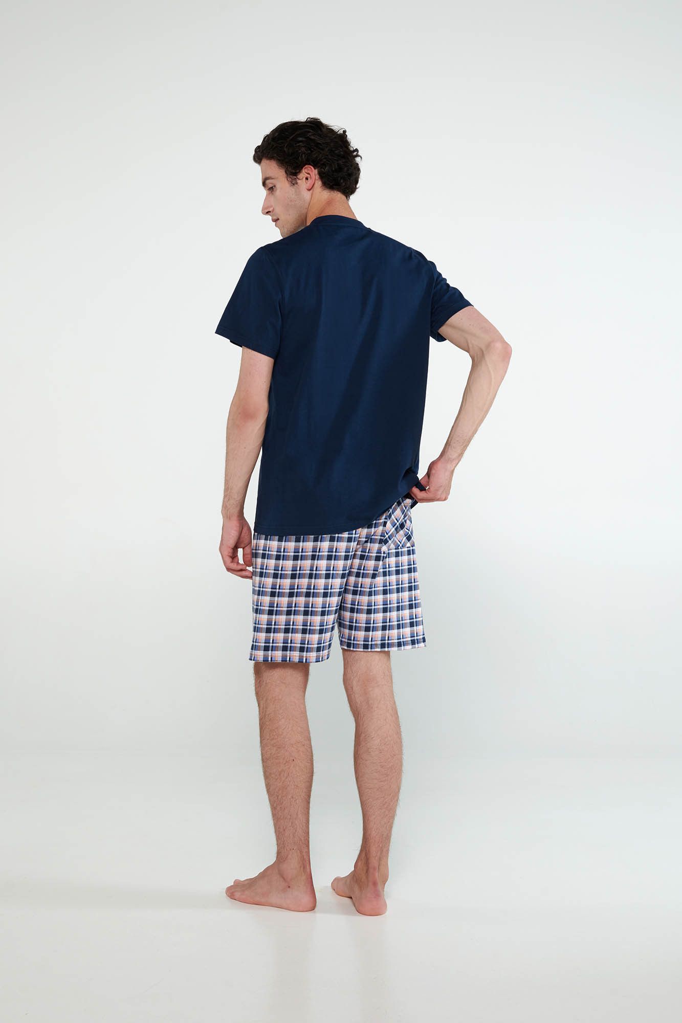100% Bavlna S. Jersey Model: výška 185 cm, velikost: Medium. Pánské pyžamo s krátkým rukávem, zapínáním na knoflíky a krátkými kalhotami. Svěží letní barvy a tenká bavlna v károvaném provedení s oranžovými detaily.