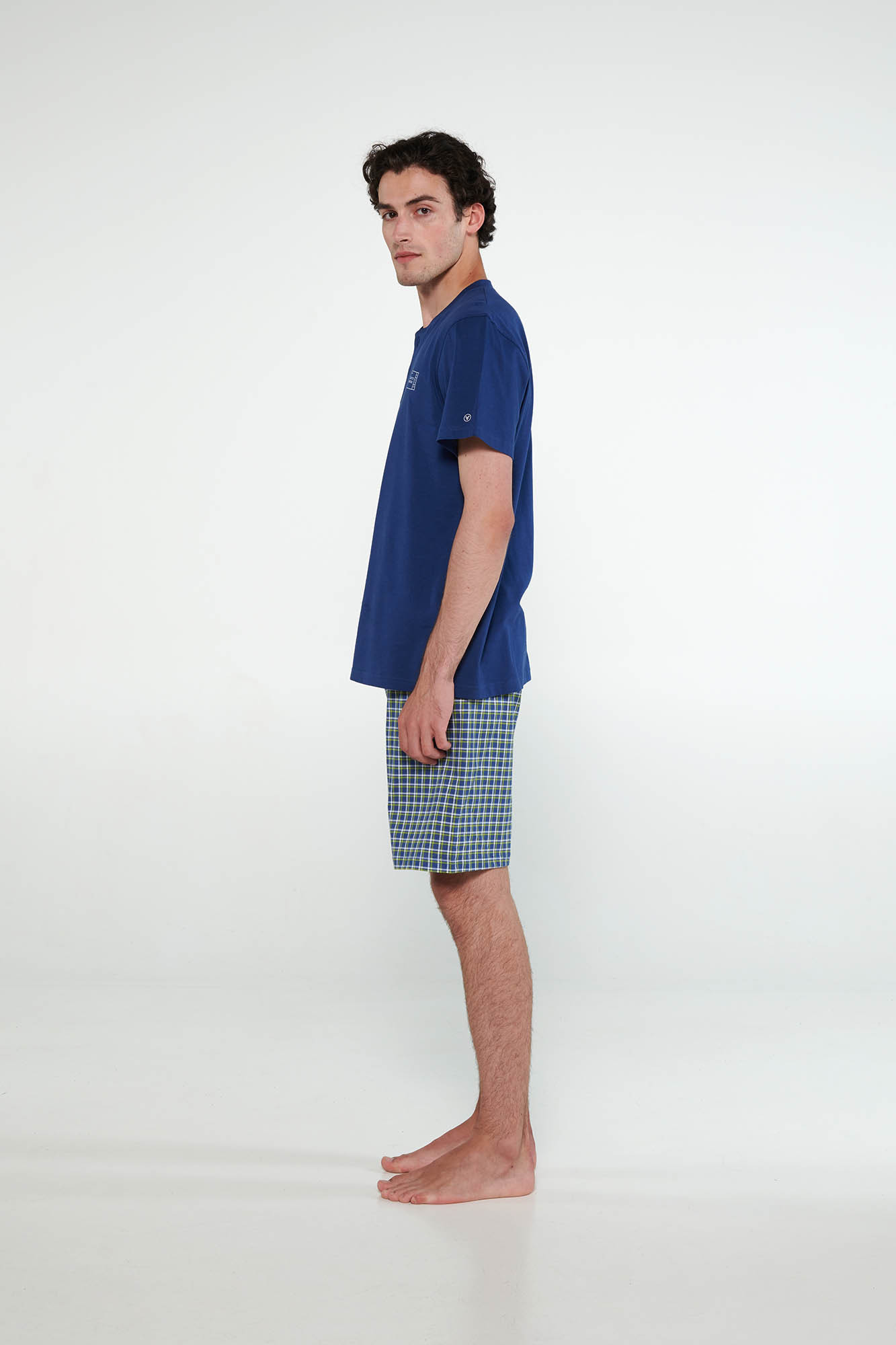 100% Bavlna S. Jersey Model: výška 185 cm, velikost: Medium. Mužské pyžamo s knoflíkovou légou a kostkovanými, krátkými kalhotami. Dodejte svému dni pohodlí díky jednoduchému, ale klasickému designu.