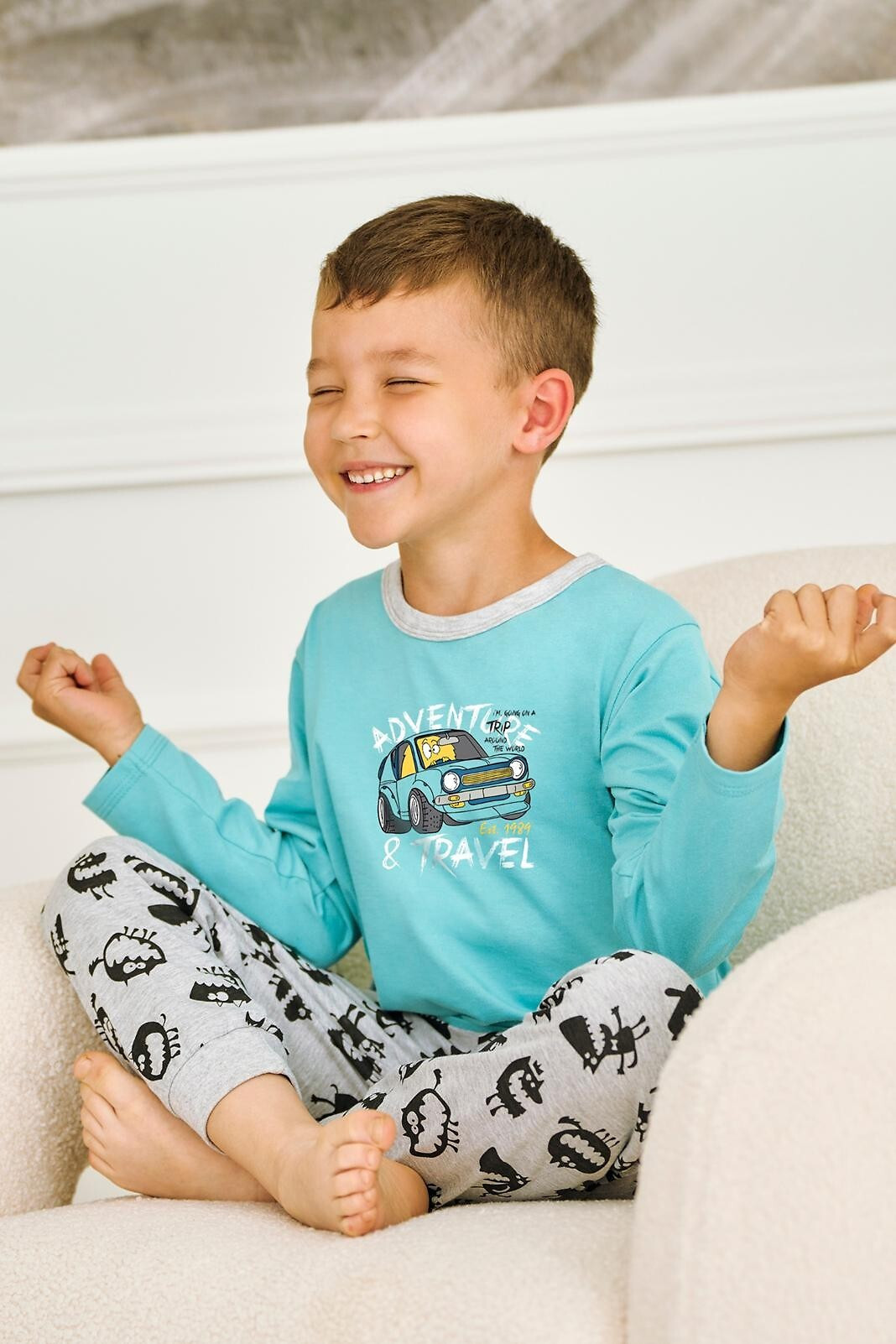 Chlapecké bavlněné pyžamo - tričko s dlouhým rukávem - barevný, veselý potisk na přední straně - dlouhé vzorované kalhoty - nohavice zakončené žebrovaným lemem - pohodlný elastický pas Složení: 100% bavlna