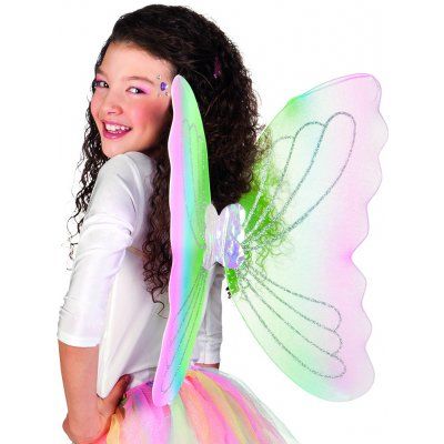 Motýlí křídla, glitrová. Uchycení gumičkou za ramena. Doplněk kostýmu motýlek. Materiál: 88% polyester, 10% iron, 2% polyethylene Rozměr: 56 x 46 cm Barva: duhová