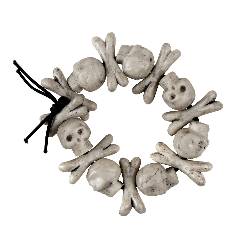 🦴 Tento náramek z umělých kostí je navlečený na pružné gumičce, takže se snadno přizpůsobí každému zápěstí.