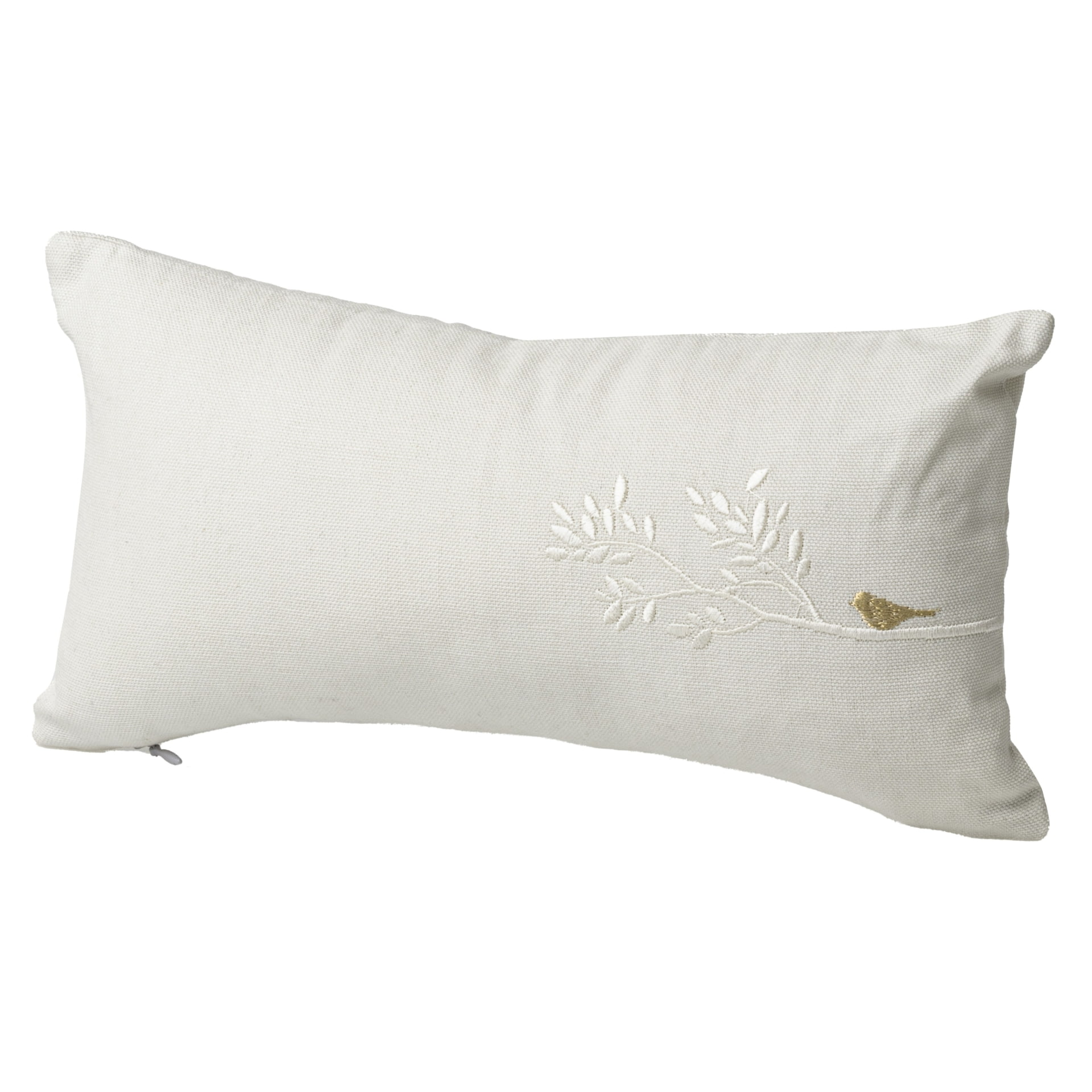 Elegantní bavlněný povlak v přírodní barvě zdobí z jedné strany decentní výšivka větvičky se zlatým ptáčkem a ze strany druhé hned několik větví, na které posedalo i více pěvců – krásný motiv symbolizující příchod jara.