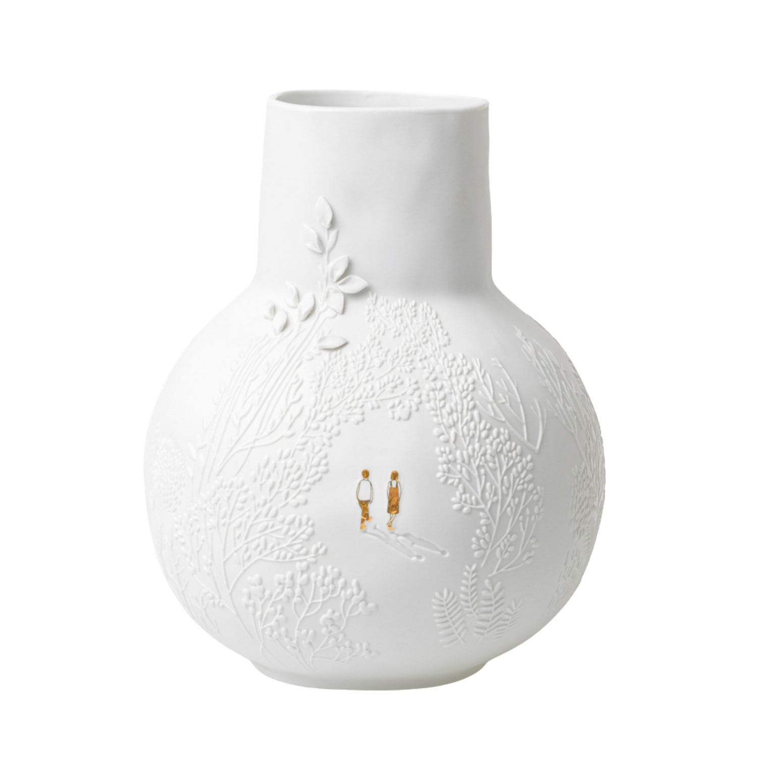 Jemný plastický vzorek jí dodává eleganci a hloubku, zatímco čisté linie a decentní barva podtrhují minimalistický styl, který skvěle zapadne do každého interiéru ve stylu hygge, scandi i moderny. Nebudete se moct vynadívat na krásně propracované detaily po celém obvodu vázy. Dvě postavy, zvýrazněné zlatou barvou, procházející se parkem vnesou romantický prvek do každého zákoutí.