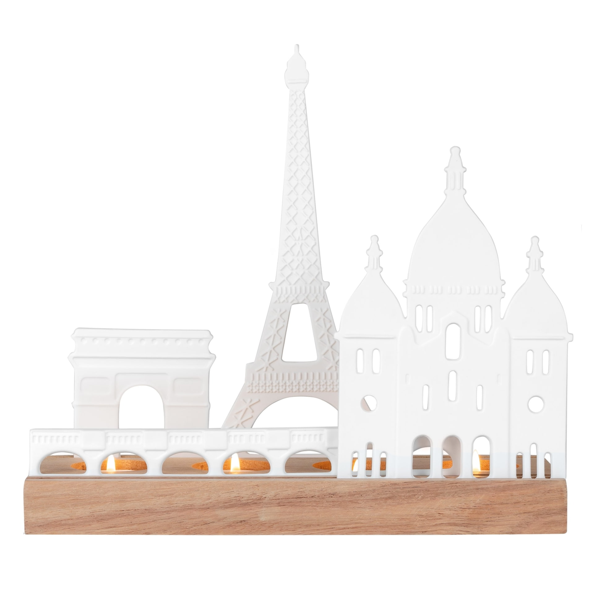 räder Porcelánový svícen City Skyline Paris, bílá barva, dřevo, porcelán. Přeneste kouzlo Paříže přímo do svého domova s tímto jedinečným svícnem z akáciového dřeva. Do připravených drážek snadno vložíte porcelánové domečky připomínající ulice francouzské metropole, které po rozsvícení svíček vytvářejí nádhernou hru světla a stínů. Svícen je určen pro 4 čajové svíčky, doporučujeme však spíše LED svíčky, které zajistí delší životnost porcelánových doplňků.