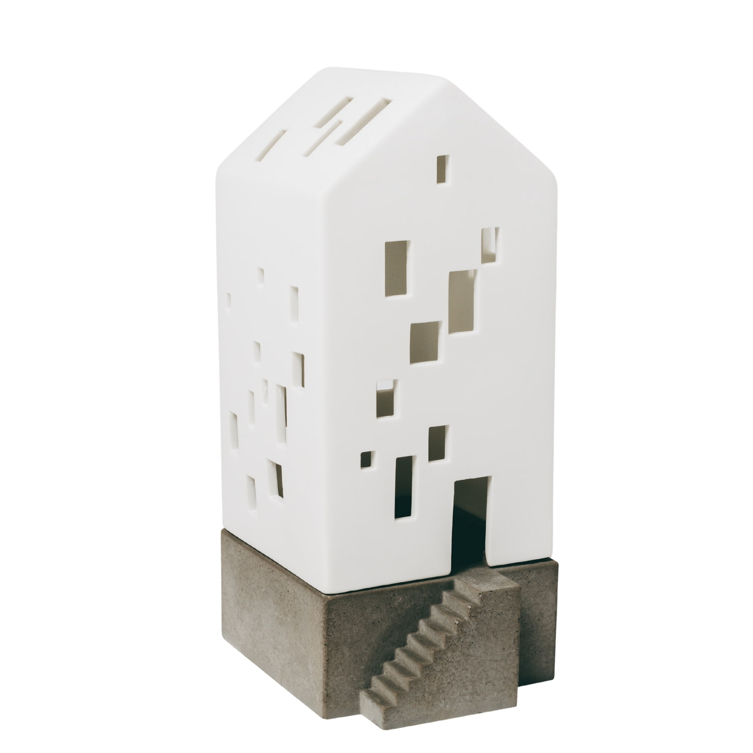 Matný neglazovaný porcelán mu dodává jemný vzhled, zatímco betonový podstavec moderní kontrast. Po zapálení čajové svíčky se v okýnkách domečku rozsvítí tlumené světlo a vytvoří pohádkovou hru stínů. Krásná dekorace pro zimní večery, adventní čas i po celý rok.