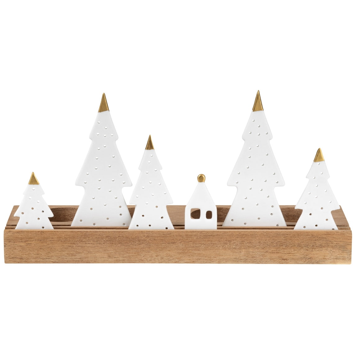 Skvěle se hodí jako zimní a vánoční dekorace, ale díky svému čistému designu najde uplatnění i během celého roku. Vytvořte si doma útulnou atmosféru plnou světla a pohody v duchu skandinávského hygge. výška 13 cm / šířka 25 cm / hloubka 7 cm Vyrobeno z akáciového dřeva a porcelánu.