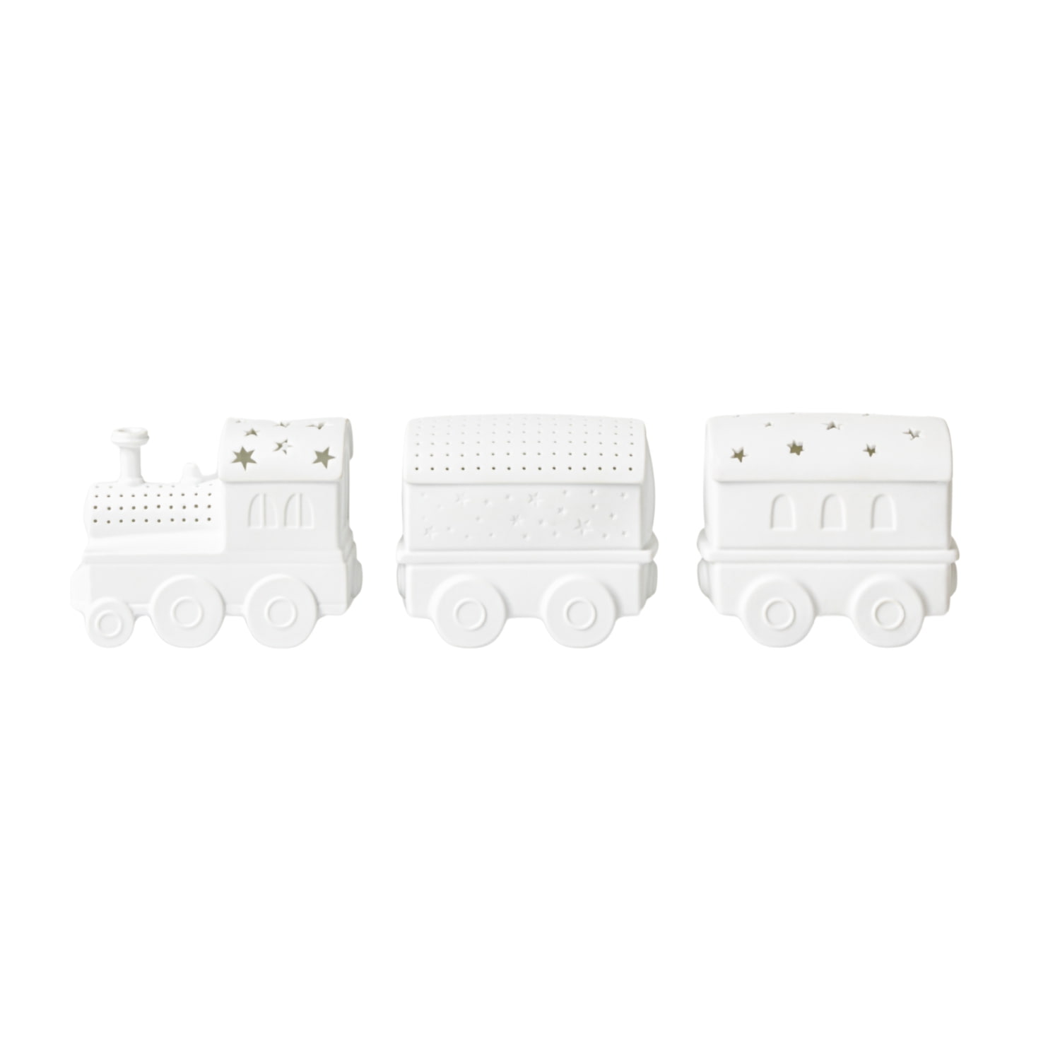 Vláček je vyrobený z kvalitního porcelánu v matné bílé barvě a je tvořen lokomotivou a dvěma vagónky s hvězdičkovými a puntíkovanými výřezy, skrz které jemně prosvítá teplé LED světlo.