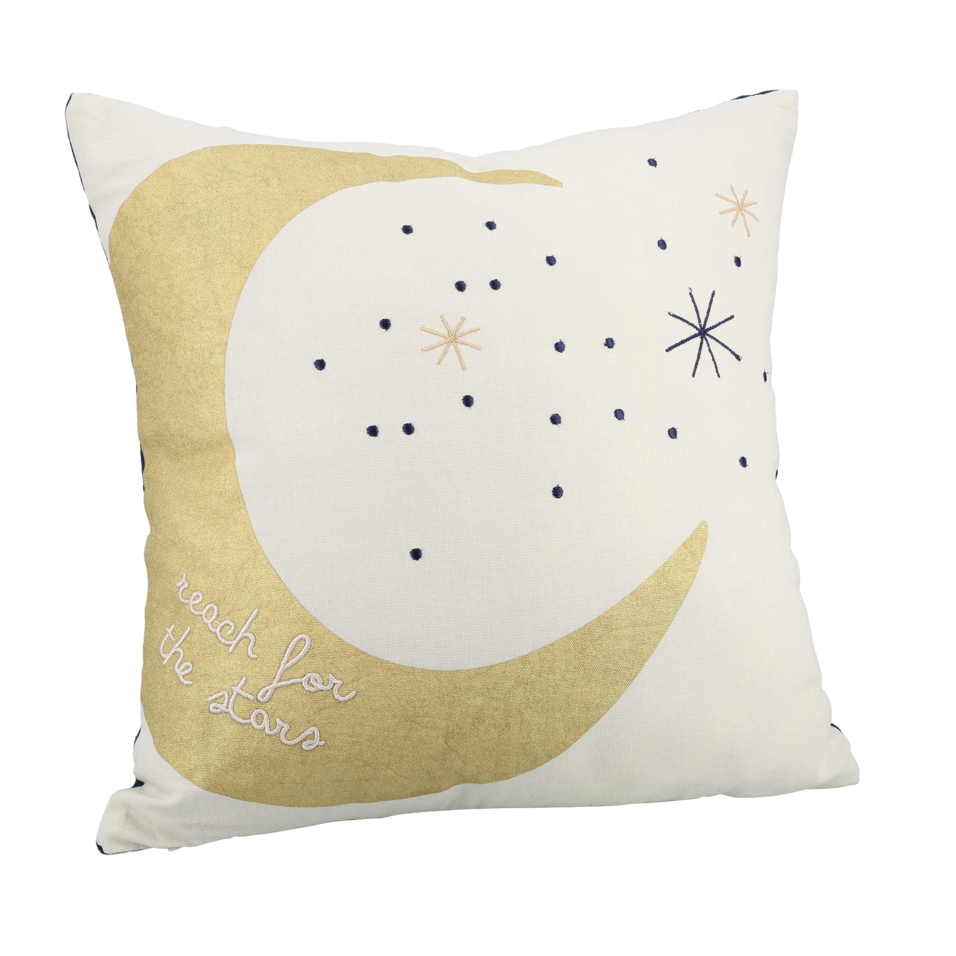 Na světlém podkladu září zlatý měsíc a tmavě modré vyšívané hvězdičky doplněné nápisem „reach for the stars“. Tento designový polštář zútulní váš obývací pokoj, ložnici i dětský pokoj a dodá interiéru jemně hravý a poetický nádech.