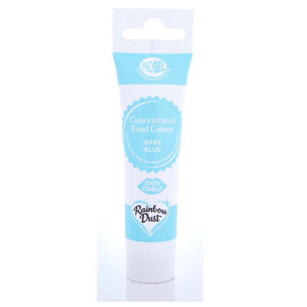 Progel® od anglické firmy Rainbow Dust jsou vysoce koncentrové, tepelně stabilní potravinářská barviva, které jsou v cukrářském světě velmi oblíbené. Jsou vhodné jak na barvení fondánové hmoty, marcipánu či bílkové polevy, tak také na barvení těsta i makronek. Jsou vhodné pro vegany i vegetariány. Složení: zvlhčující prostředek (glycerol E422), barviva E133, voda, modifikovaný škrob (tapioka). Upozornění: Barviva E110, E104, E122, E102, E124, E129 mohou nepříznivě ovlivňovat činnost a pozornost dětí. Doporučené dávkování: 3g na 1kg dekorace a dortu (max.8g)