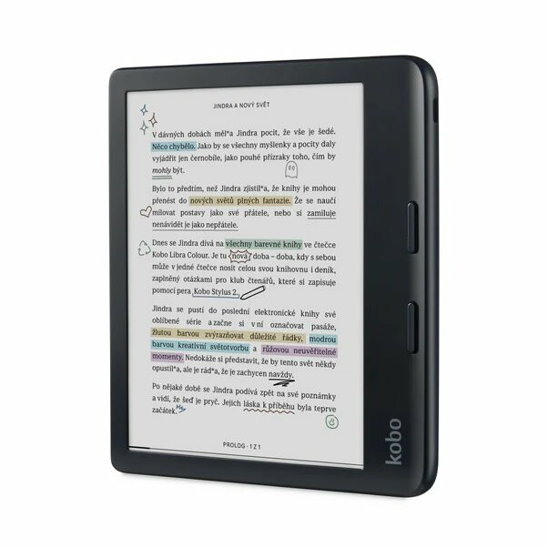 Představujeme naši dosud nejvíce inspirativní elektronickou čtečku: Kobo Libra Colour. Vykouzlete na okrajích stránek poznámky, uspořádejte si myšlenky nebo zvýrazněte inspirativní řádky a při tom všem využívejte barvy. Je kompatibilní s perem Kobo Stylus 2, takže se klidně nechte vtáhnout oblíbenými příběhy a označujte si ve zbožňovaných e-knihách důležité momenty nebo zvýrazňujte emotivní pasáže. Barvami prostoupené fiktivní i reálné světy. Zažijte požitek ze čtení v barvách s uklidňující barevnou paletou 7" displeje E Ink Kaleido™ 3. Ožívají obálky knih, ilustrace, psaní poznámek i další. Žádný odlesk na slunečním světle, žádná upozornění – jen vy, vaše kniha a potěšení v jasných barvách. Barevně označujte a zvýrazňujte text v e-knihách díky kompatibilitě s perem Kobo Stylus 2¹. Objevte novou dimenzi čtenářského světa při podtrhování inspirativních řádků, ať vaše stránky získají trochu osobitosti. Ať už chcete zaznamenat poznámku pro čtenářský klub, zápis do deníku nebo inspirativní myšlenku, nikdy to nebylo snadnější ani zábavnější než s integrovanými poznámkami Kobo a perem Kobo Stylus 2¹. Jednoduše a barevně sdílejte své myšlenky (nebo je prostě zapište, ať o ně nepřijdete) v zápisnících zálohovaných na Kobo Cloud a s možností připojení na Dropbox nebo Google Drive. Díky ergonomicky zakřivenému tvaru, který dokonale padne do ruky, je čtení se čtečkou Kobo Libra Colour radost. To umocňují tlačítka pro otáčení stránek, možnost otočit obrazovku doleva/doprava, písmo běžné velikosti, nastavení okrajů a režim čtení na šířku. Aby se vám dobře četlo v noci, funkce ComfortLight PRO automaticky redukuje modré světlo během dne. Nebo si na čtení zapněte tmavý režim – vaše oči vám poděkují. Čtečka Kobo Libra Colour je promyšleně vyrobena z recyklovaného plastu a plastu, který by jinak skončil v oceánu a navíc je zcela vodotěsná². Tuto elektronickou čtečku lze také opravit, takže můžete prodloužit její životnost a vyměnit základní komponenty. Díky 32GB úložišti³ a týdnům výdrže baterie⁴ můžete mít u sebe až 24 000 elektronických knih nebo 150 audioknih Kobo. Poslouchejte audioknihy Kobo pomocí integrované bezdrátové technologie Bluetooth®⁵. Upravte si velikost písma, okraje a změňte styl písma, abyste si čtení přizpůsobili svým potřebám. Používejte Pocket pro ukládání článků k pozdějšímu offline čtení.