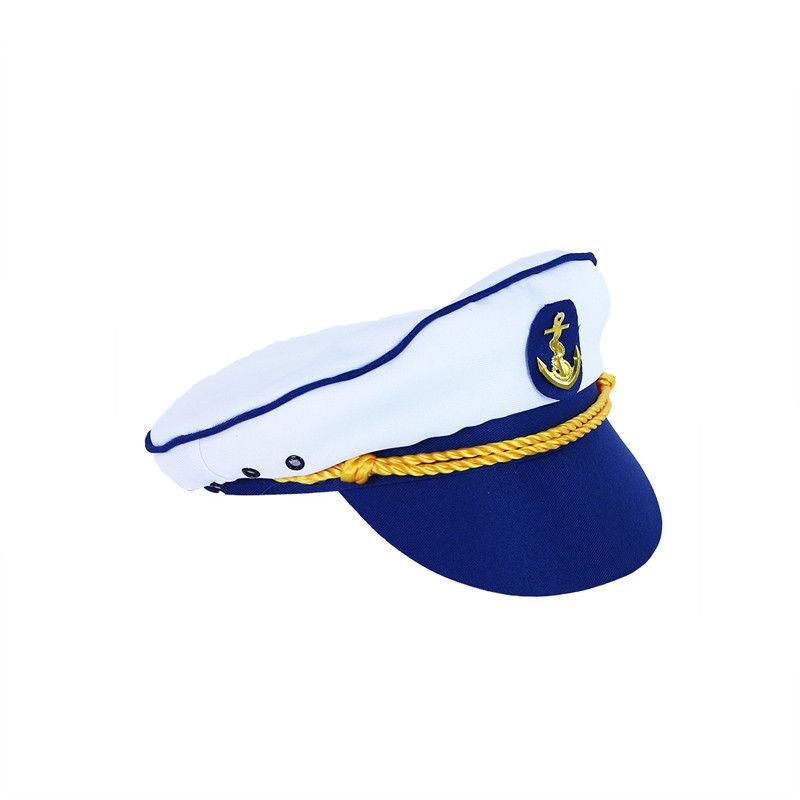 Bílá námořní čepice s modrým kšiltem a lemováním je vpředu dekorována zlatou podkovou.