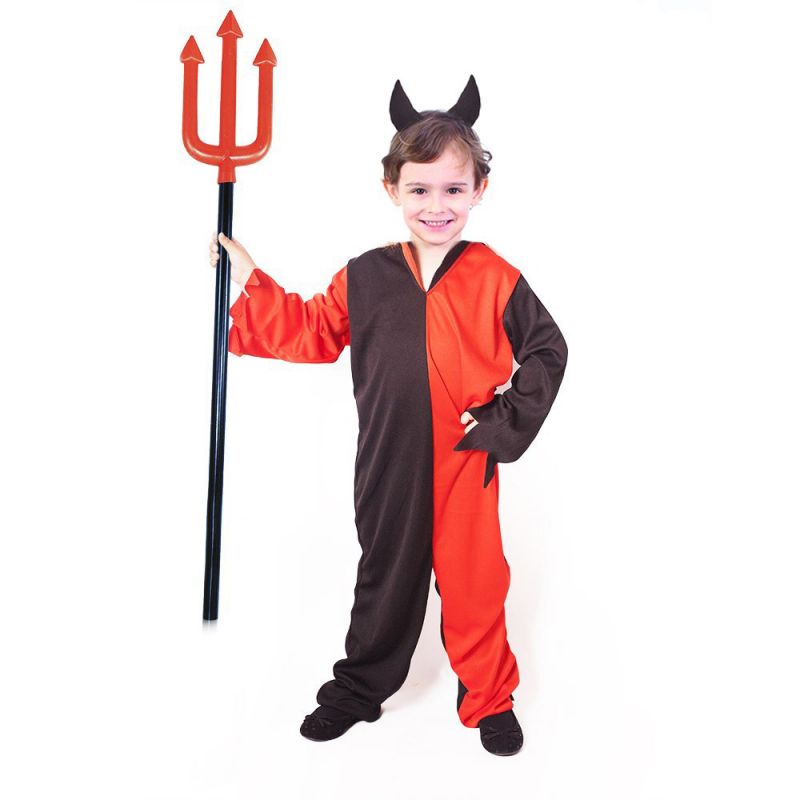 Tento dětský kostým čertíka zahrnuje klasický černý overal s červenými akcenty a rohy na čelence.
