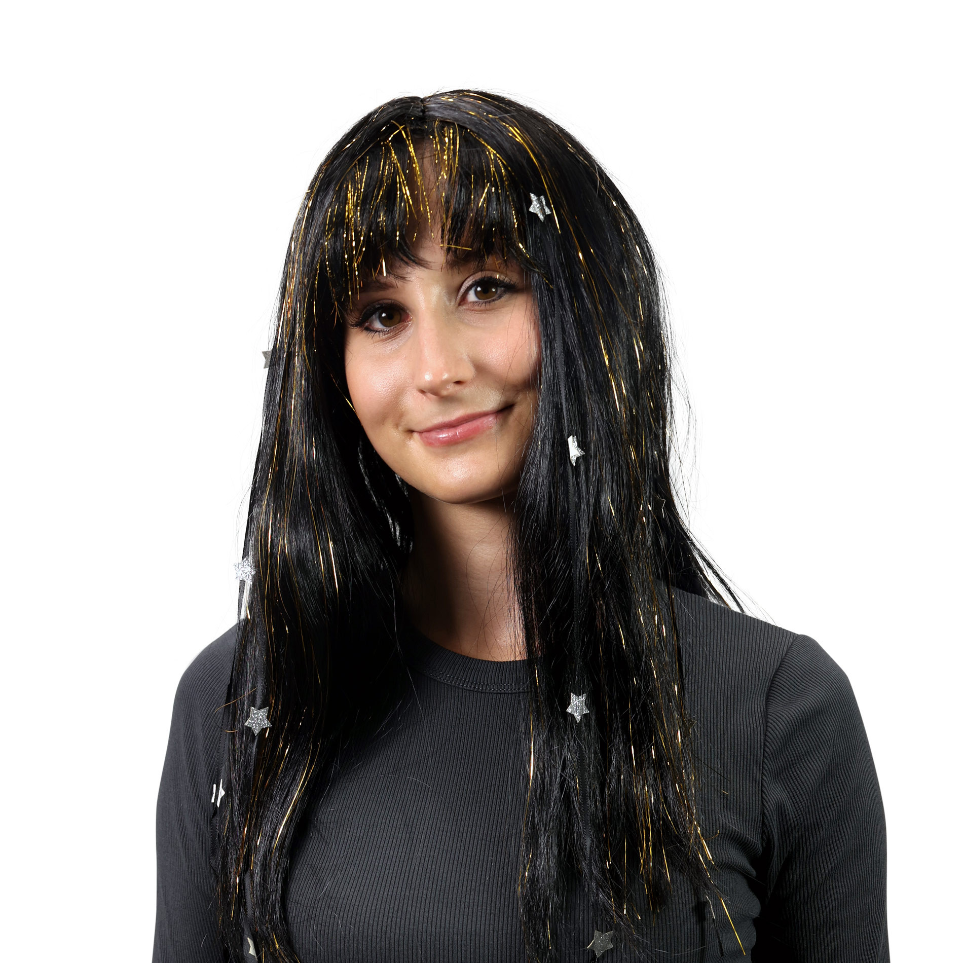 Karnevalová paruka v černé barvě je zdobená zlatými vlásky a stříbrnýma hvězdičkama. Perfektní doplněk na karneval nebo párty! je perfektní volbou pro každého, kdo chce změnit svůj vzhled během okamžiku.