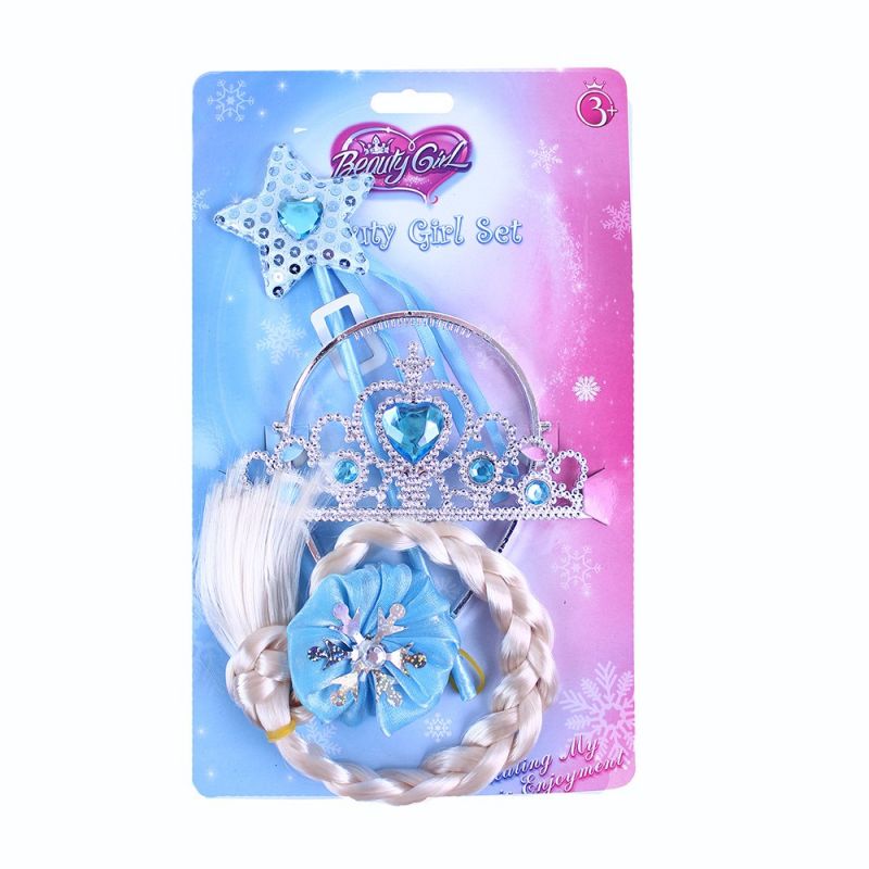 Překrásný set korunky, hůlky a copu pro všechny zimní princezny! Korunka je dekorována ozdobnými kamínky v modré barvě. Perfektní doplněk ke kostýmu!