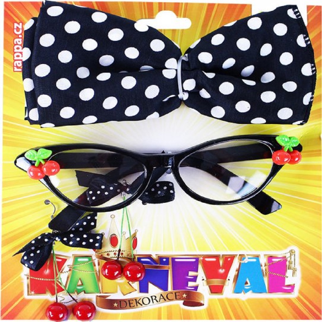 Sada třešňová obsahuje černé brýle, které jsou zdobeny malými třešničkami, třešňové náušnice s puntíkovanou černou stužkou a puntíkovaný šátek.